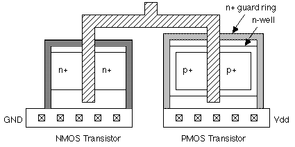 with guard rings. Electrostatic discharge can trigger latchup. ESD enters